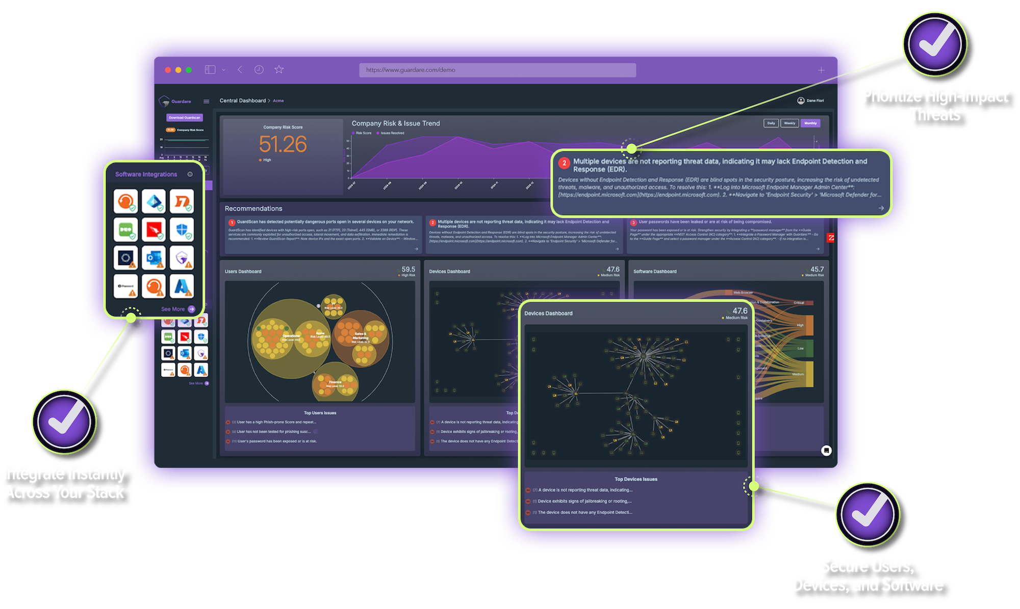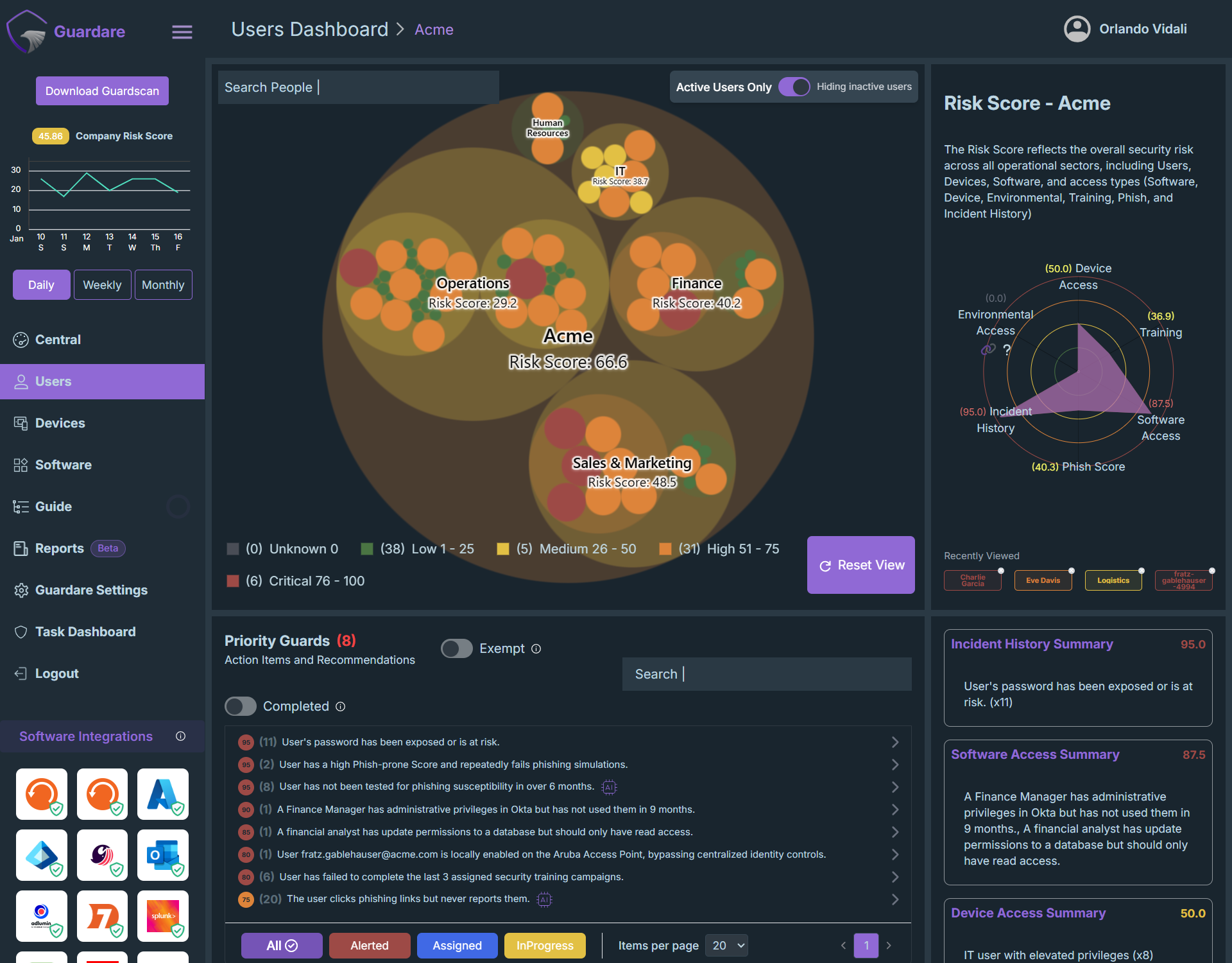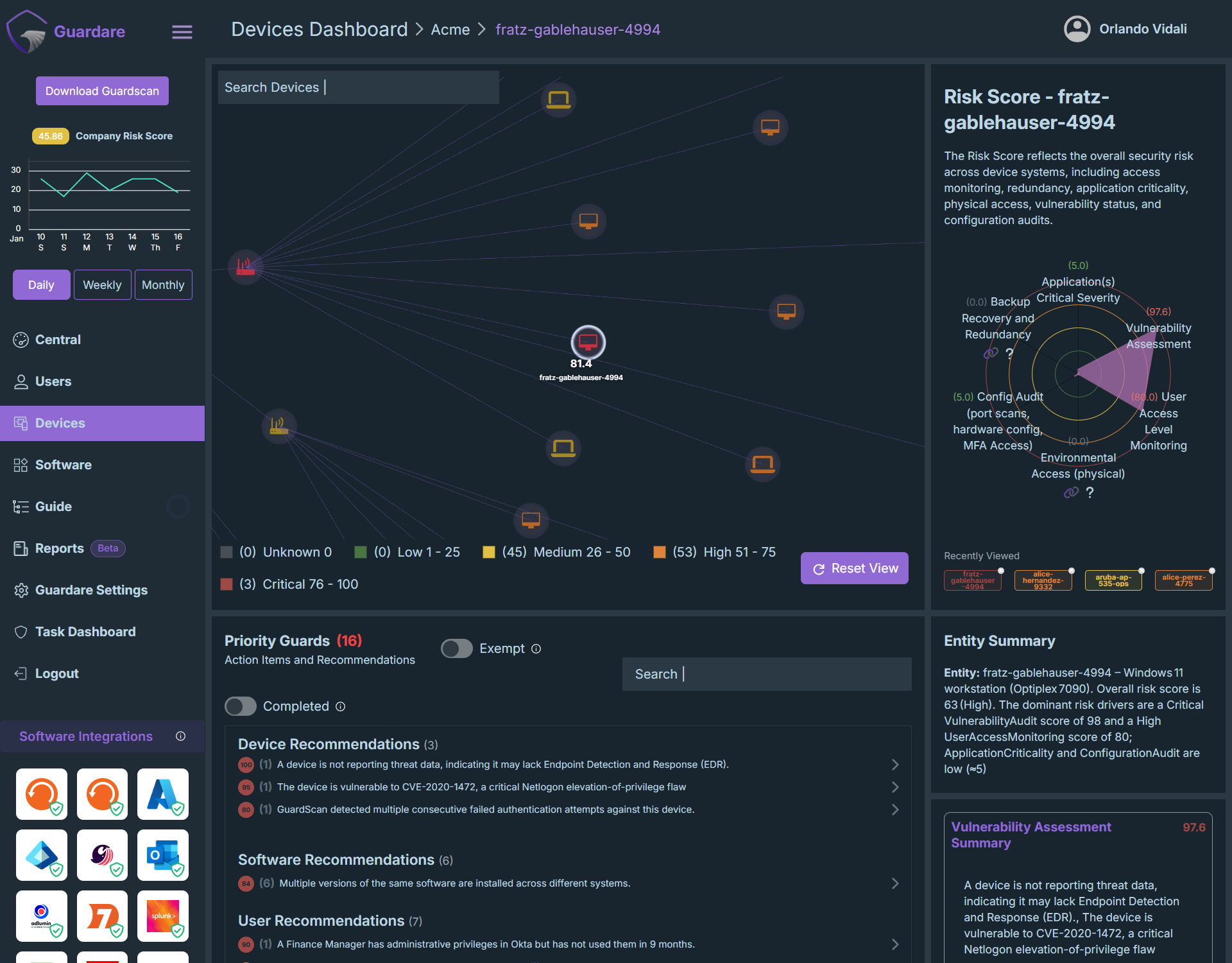 See your entire environment in a single dashboard. Guardare turns chaotic data from your organization’s people, devices and software into insights and actionable steps.
